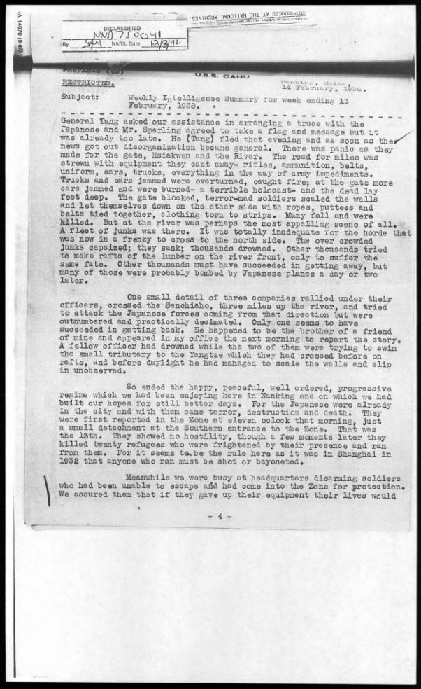 General Tang asked our assistance in arranging the truce with the Japanese and Mr. Sperling agreed to take a flag and message but it was already too late.