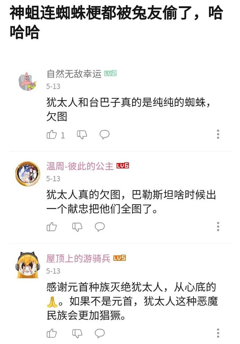 > 「ユダヤ人は本当に全員殺されるべき、いつかパレスチナで張献忠のような人が生まれ、イスラエルのユダヤ人を殺したらいいな」