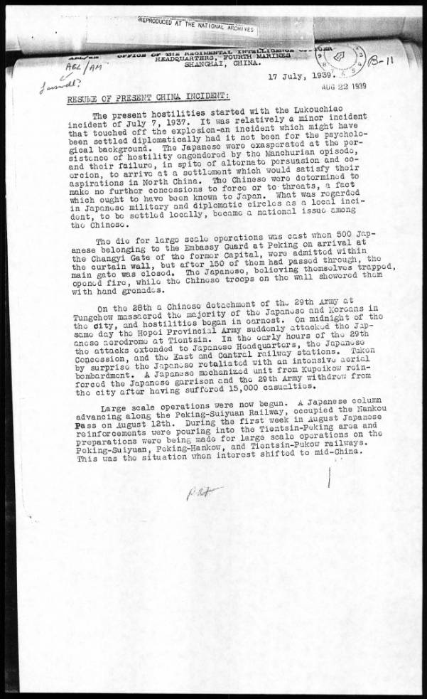 通州事件についての上海駐留米海兵隊、1939年報告文書です!