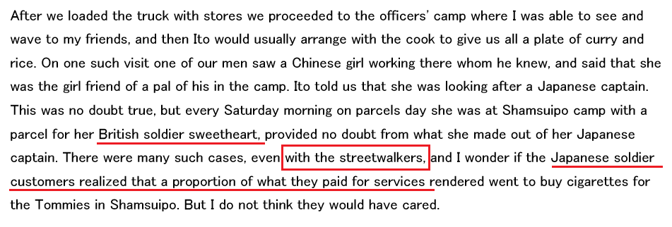 例えば香港の場合。日本軍が攻略したら、それまで英国軍将兵に付いていたシナ娼婦は日本兵相手に儲ける。英国兵に情も移ってか愛人になってるから、日本兵からせしめたカネで英国兵にプレゼントする。