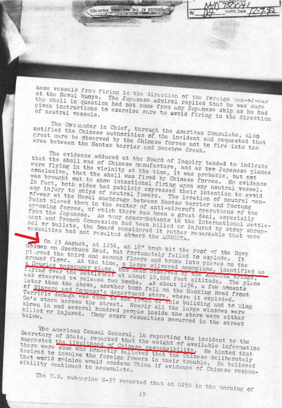 支那事変、本格的戦闘へ突入となった第二次上海事変での中国軍による市街地への空襲。