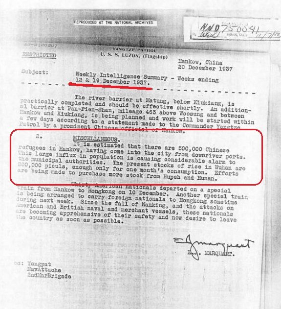 例えば、米アジア艦隊揚子江部隊の旗艦USSルソンによる報告(1937年12月12-19日)を見ても「漢口に避難民50万人、下流からやってきた」